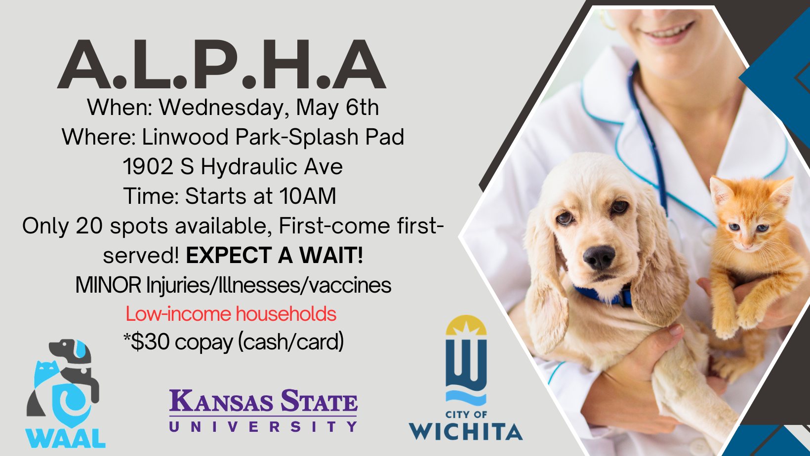 ALPHA clinics are urgent care type clinics designed for low-income families who can't afford services elsewhere. Both dogs and cats are welcome. This is not a surgery or spay/neuter clinic.
